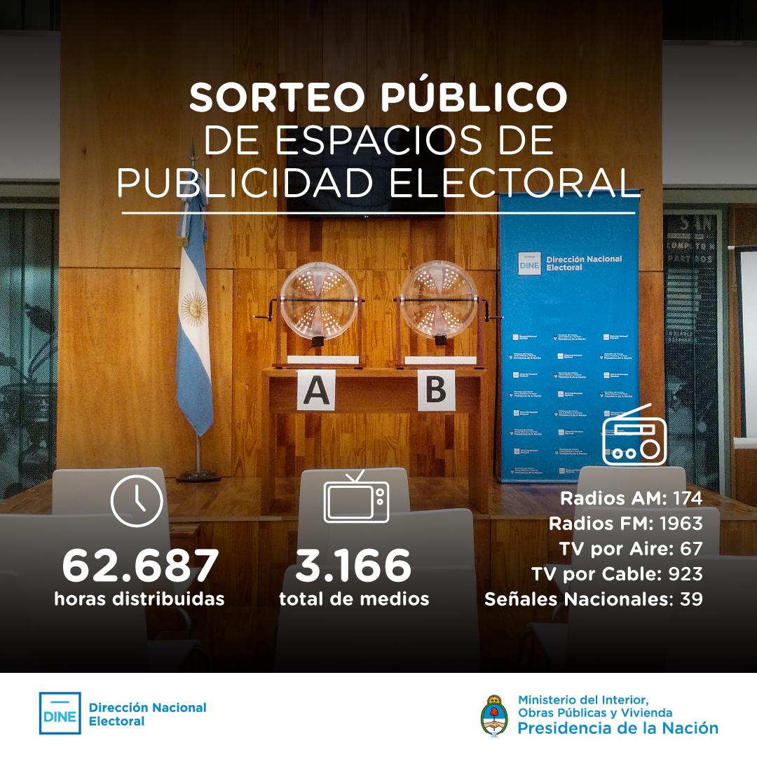 El acta del sorteo, que está publicada en el sitio web de la Dirección Nacional Electoral, distribuye los espacios por provincia y por categoría, en los distintos canales de televisión y radios AM y FM que se emiten en cada distrito.