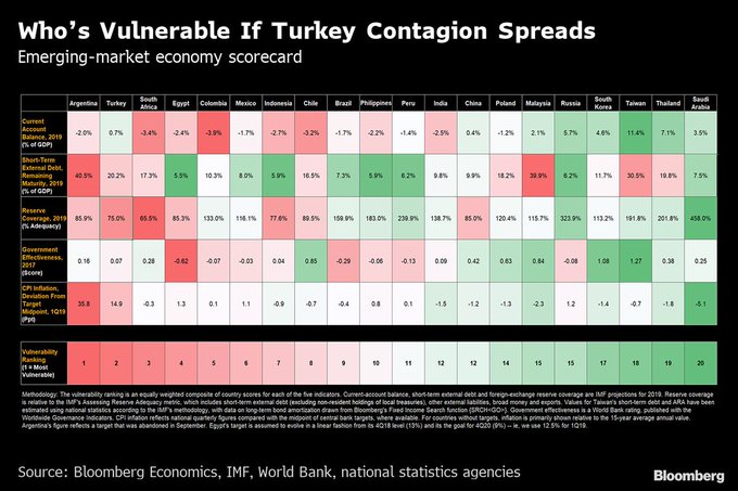 La Argentina es el país más vulnerable a los movimientos de mercados de capitales entre naciones emergentes, y sus indicadores de situación económica están por debajo de Brasil y otros veinte países, según la agencia Bloomberg.