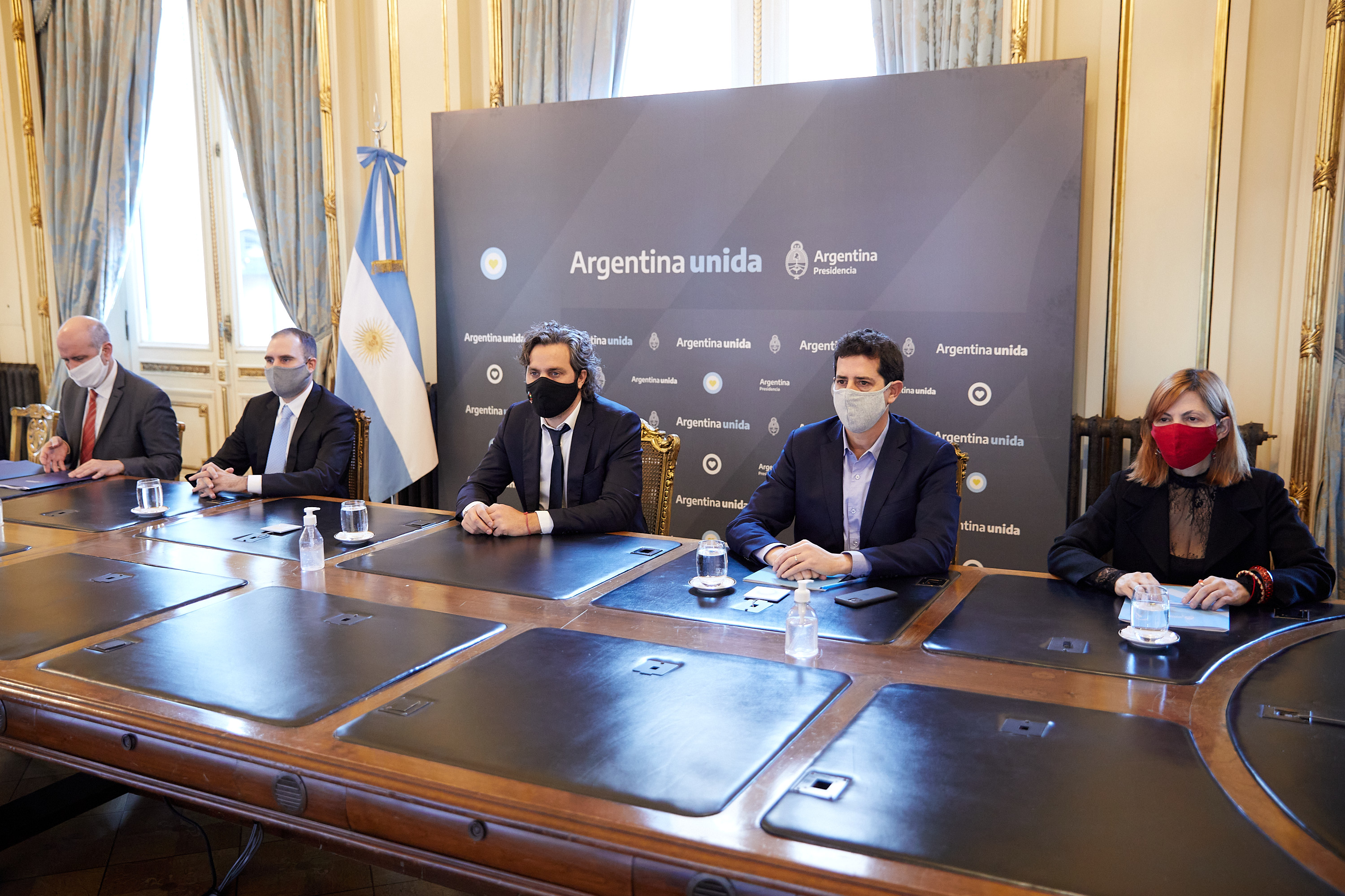 El jefe de Gabinete, Santiago Cafiero; el ministro de Economía, Martín Guzmán, y su par de Interior, Wado de Pedro, encabezaron este jueves una videoconferencia con los gobernadores de Jujuy, Gerardo Morales; de La Rioja, Ricardo Quintela; de Tierra del Fuego, Gustavo Melella; y de Salta, Gustavo Sáenz, con quienes firmaron el acuerdo del Fondo Fiduciario para el Desarrollo Provincial (FFDP), por el cual el Gobierno nacional asistirá a estas provincias con más de 6.400 millones de pesos.
