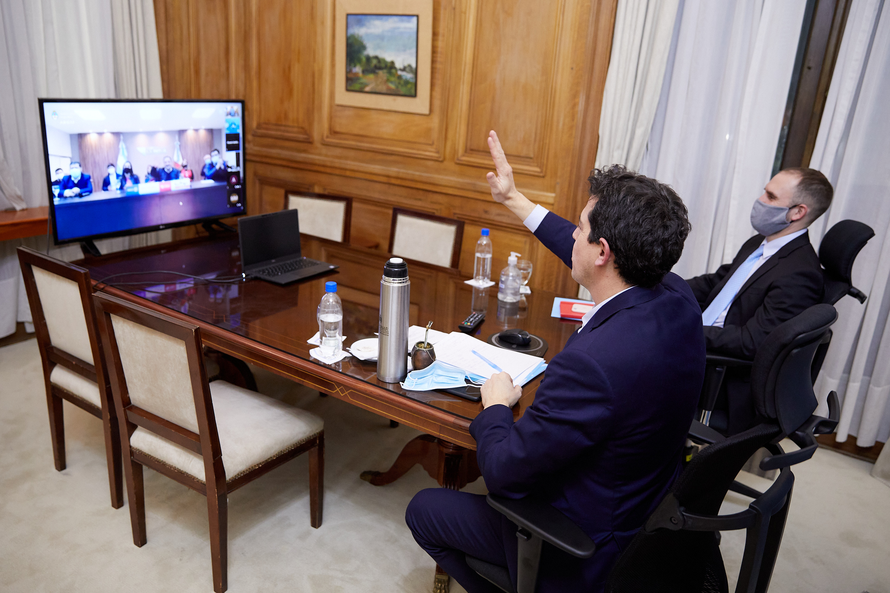 De Pedro, Kulfas y Guzmán también mantuvieron teleconferencias con los gobernadores de Córdoba, Juan Schiaretti; de Santiago del Estero, Gerardo Zamora, de Neuquén, Omar Gutiérrez; de Tucumán, Juan Manzur; de Tierra del Fuego, Antártida e Islas del Atlántico Sur, Gustavo Melella; de Mendoza, Rodolfo Suárez, y la gobernadora de Río Negro, Arabela Carreras.