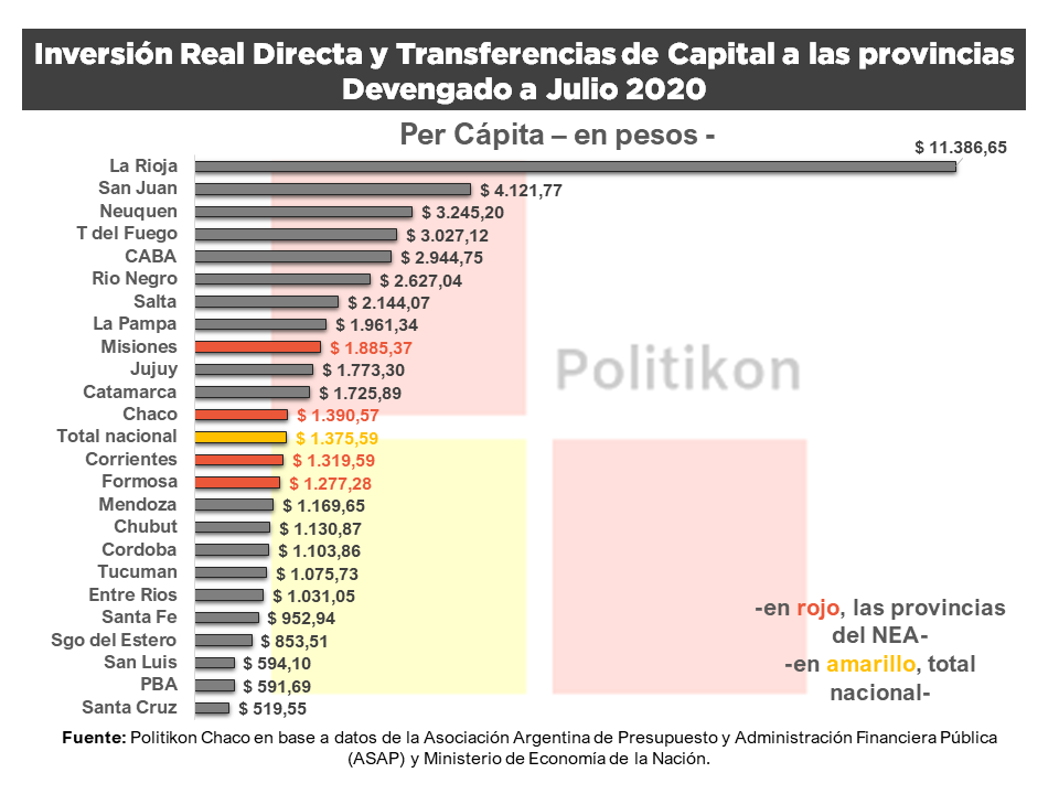 A nivel per cápita se observan notables diferencias, tal como lo venimos detallando mes a mes. La Rioja encabeza el ranking: por cada riojano, entre enero y julio 2020, se llevan invertidos $11.386,6 en concepto de capital; en el otro extremo, vemos que por cada habitante de Santa Cruz se invirtió solo $519,5 de acuerdo a un informe elaborado por la consultora Politikon Chaco.