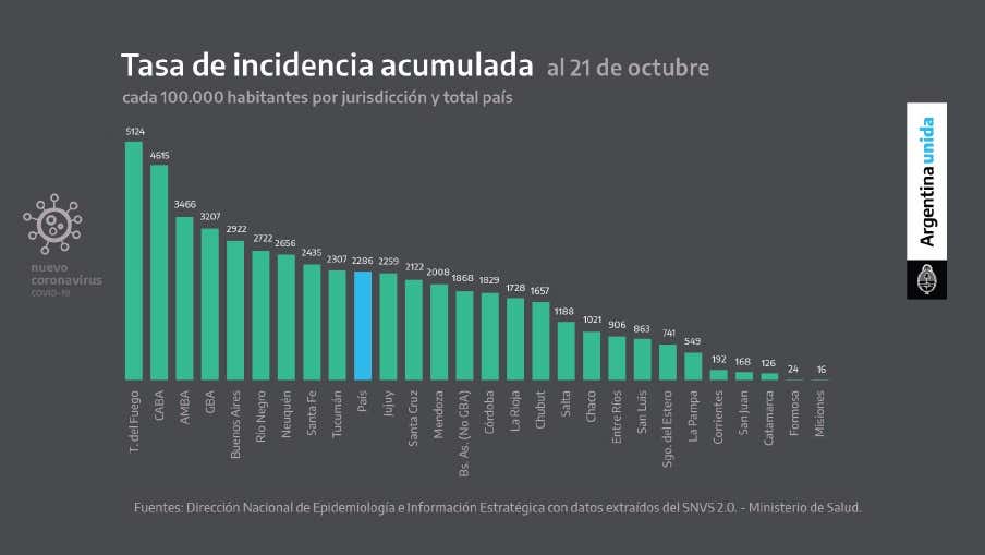 Respecto a la tasa de incidencia acumulada, por cada 100.000 habitantes, al 21 de octubre, el cuadro está liderado por Tierra del Fuego, con 5.124 casos.