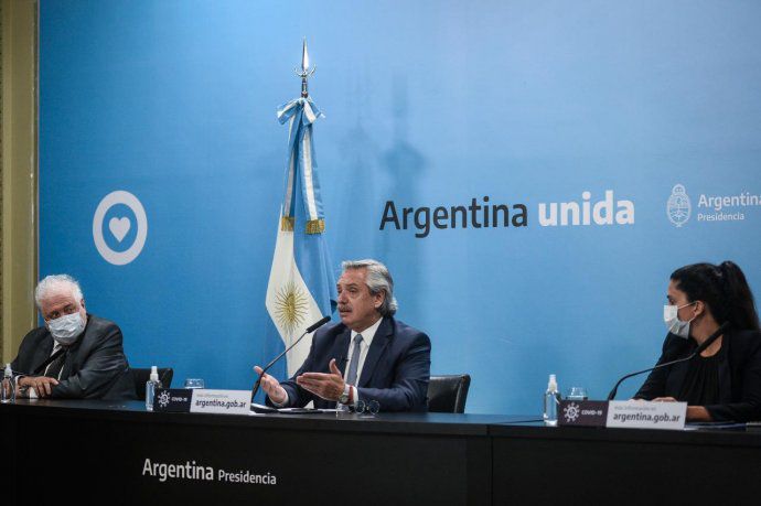 El Presidente anunció desde la Casa Rosada una nueva extensión de los protocolos obligatorios contra el Covid-19, en compañía del ministro de Salud ,Ginés González García, y la directora Ejecutiva de PAMI, Luana Volnovich.