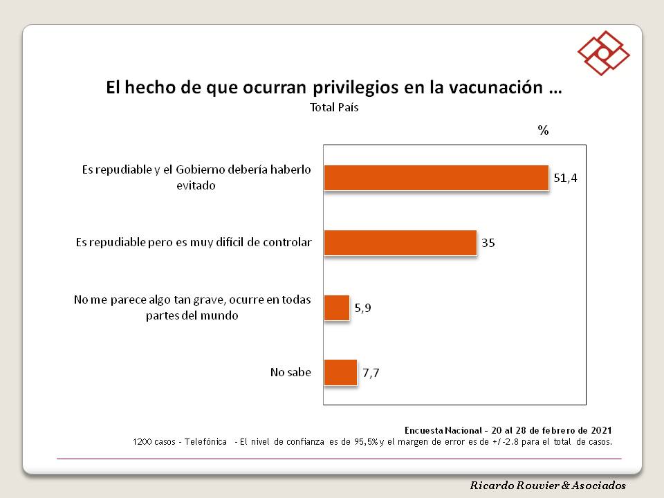El 51% de los argentinos califica lo sucedido con la vacunación VIP como repudiable y cree que el Presidente debiera haber tomado medidas para que esto no suceda, el 35% también sanciona lo ourrido, pero cree que son cuestiones difíciles de controlar; un 6% le resta importancia.
