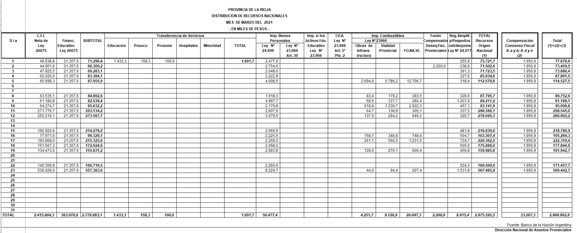 Según la Dirección Nacional de Asuntos Provinciales, el Gobierno de La Rioja recibió $2.908 millones por coparticipación federal (goteo diario de recursos nacionales).