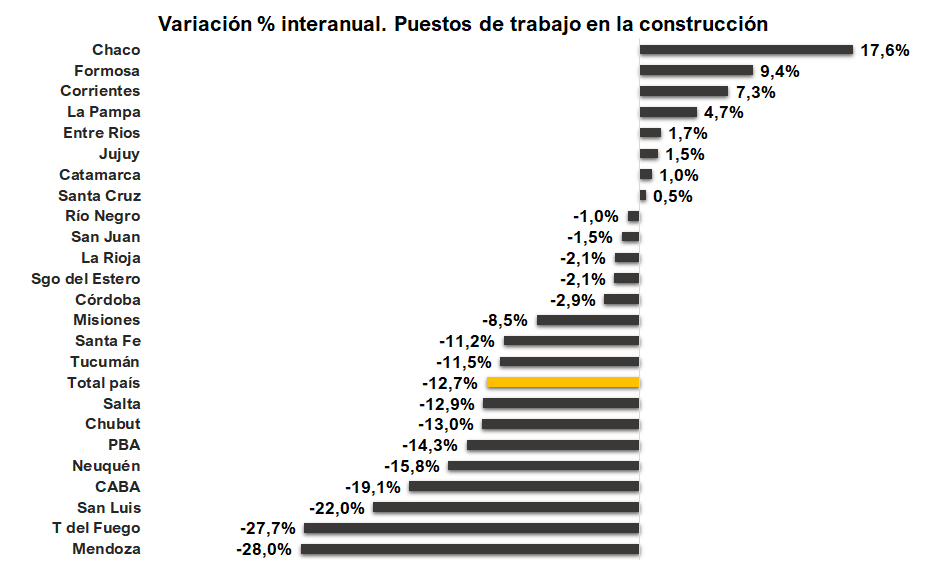 El escenario nacional mostró que ocho jurisdicciones tuvieron alzas: el podio está integrado por Chaco, Formosa y Corrientes, como ya se mencionó, y le siguen La Pampa, Entre Ríos, Jujuy, Catamarca y Santa Cruz. Otras ocho provincias tuvieron caídas, pero menores al total nacional, y finalmente, Mendoza (-28%), Tierra del Fuego (-27,7%) y San Luis (-22%) muestran las mayores caídas.
