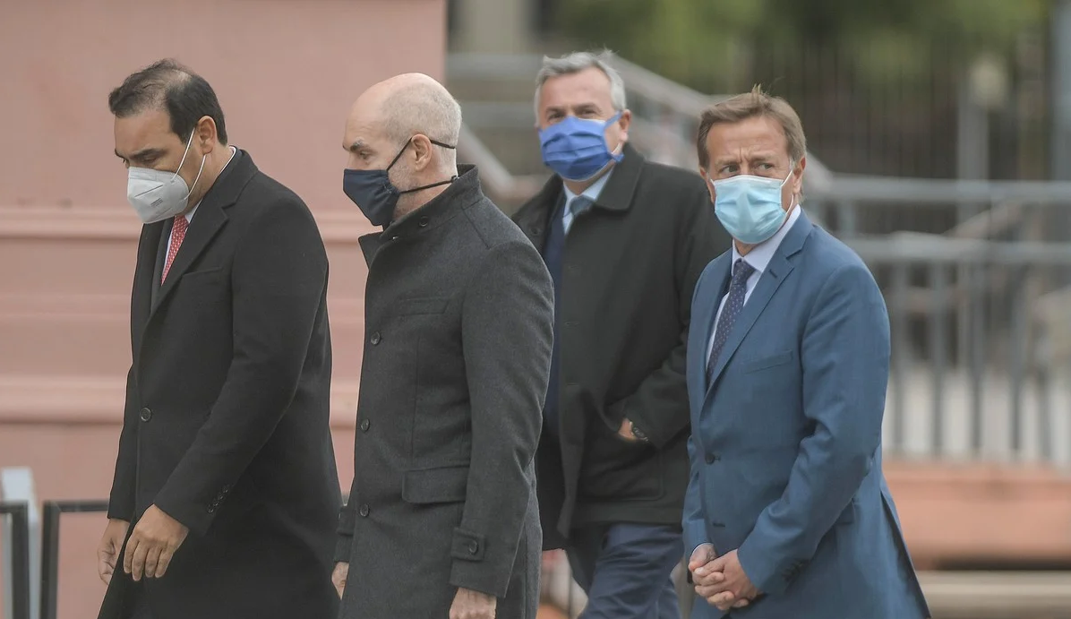 Horacio Rodriguez Larreta junto a los gobernadores Gustavo Valdés , Gerardo Morales y Rodolfo Suarez. Los cuatro opositores están entre los mandatarios con menor imagen negativa. Foto Federico López Claro.