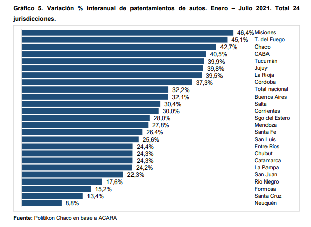 El podio está conformado por Jujuy, CABA y Córdoba (+36,4%, +25,2% y +16,3% respectivamente), al tiempo que la media nacional marcó un alza del 6,1%. Las tres mencionadas, y otras cuatro provincias (Entre Ríos, Chaco, Buenos Aires y Tucumán) tuvieron crecimientos por encima de esa media nacional, y dos (La Rioja y Corrientes) también tuvieron subas, pero inferiores al total país.