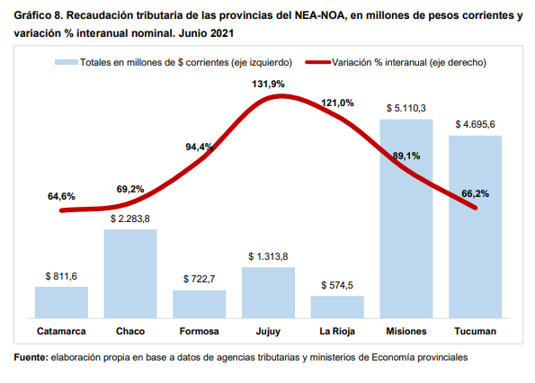 Entre las siete provincias del Norte Grande con datos publicados, acumularon una recaudación propia total por $15.512,4 millones en mayo, que implica una expansión nominal contra junio 2020 del 81%. Desagregando la región, el NEA creció en un 83,4%, y el NOA un 78,4%.
