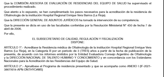 El Ministerio de Salud de la Nación, a través de la Subsecretaría de Calidad, Regulación y Fiscalización, acreditó la Residencia médica de Oftalmología de la institución Hospital Regional Enrique Vera Barros, en la Categoría B por un período de tres años a partir de la fecha de publicación de la presente, de acuerdo con los informes emitidos por la Entidad Evaluadora Consejo Argentino de Oftalmología y en concordancia con los Estándares Nacionales para la Acreditación de las Residencias del Equipo de Salud.