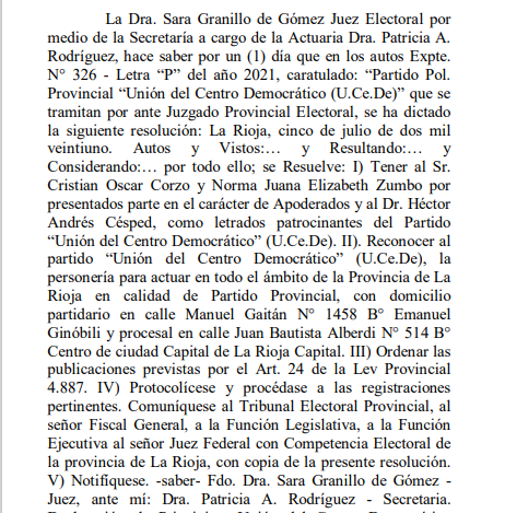 Sara Granillo de Gómez, Juez Electoral por medio de la Secretaría a cargo de la Actuaria Patricia Rodríguez, hizo saber en los autos Expte. N° 326 – Letra “P” del año 2021, caratulado: “Partido Pol. Provincial “Unión del Centro Democrático (U.Ce.De)” que se tramitaron el Juzgado Provincial Electoral, se dictó la siguiente resolución: