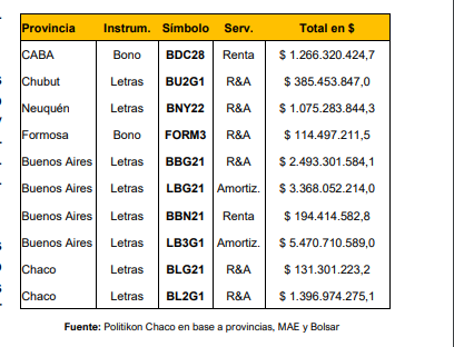 Esta semana, dos provincias colocaron deuda en el mercado de capital, a través de Letras. Chaco se hizo de $1.301 millones tras adjudicar Letras de Tesorería Clase 22a 28 días (TNA 37,5%), al tiempo que otras dos clases (23 y 24) se declararon desiertas por falta de oferta.