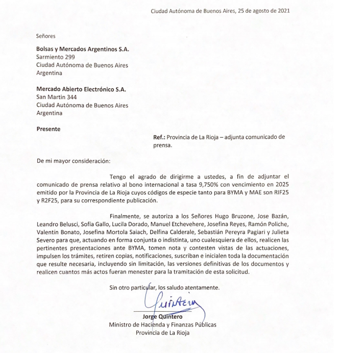 El ministro de Hacienda, Jorge Quintero, informó a la Bolsa de Comercios de Buenos Aires son un principio de acuerdo con los tenedores del Bono Verde, donde detalla además quienes llevan adelante las negociaciones en nombre del Gobierno de La Rioja.