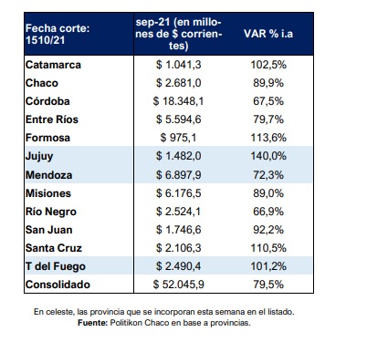 En ese marco, el top tres de mayores crecimientos está compuesto por Jujuy (140%), Formosa (113,6%) y Santa Cruz (110,5%); pero también Catamarca y Tierra del Fuego tienen alzas por encima del 100%.